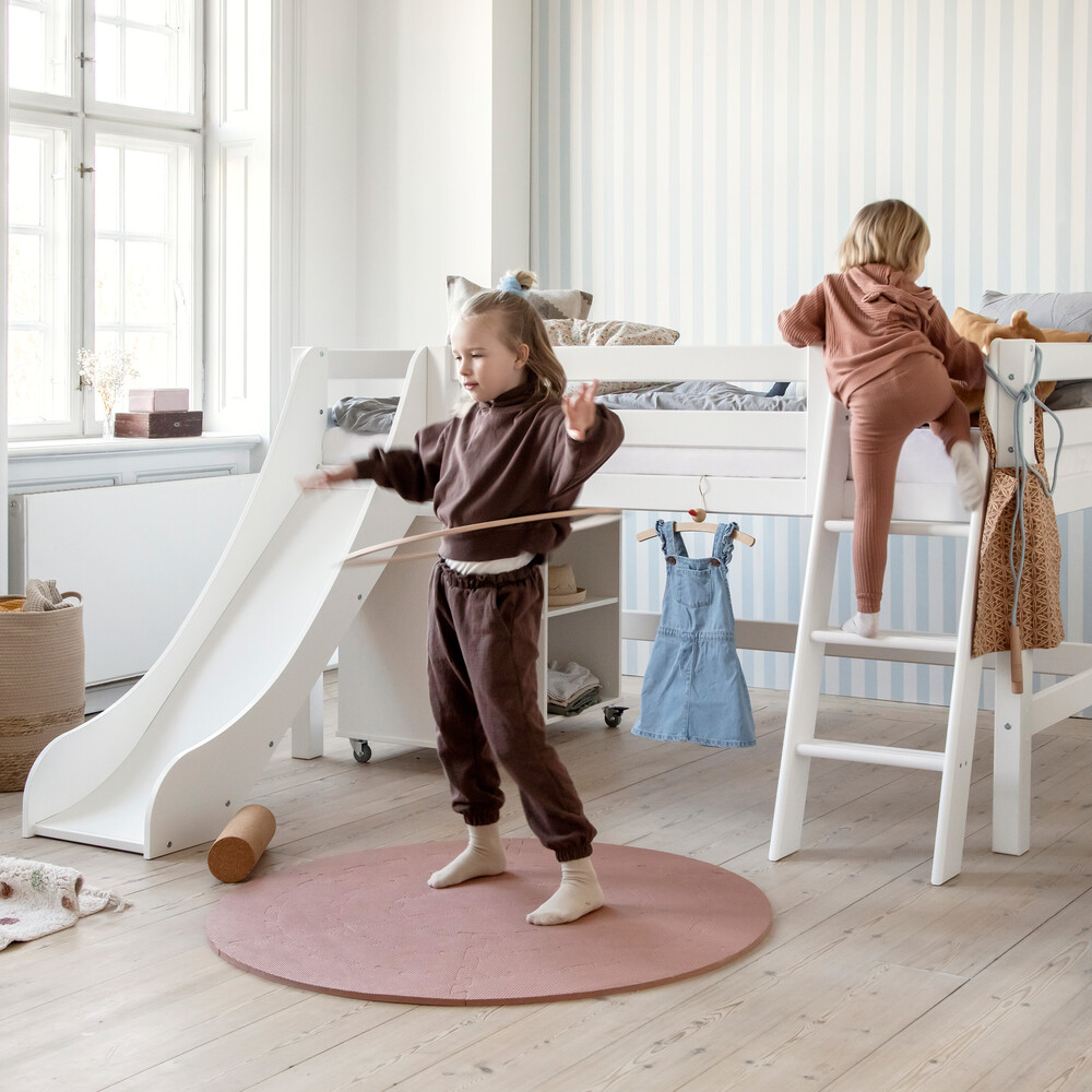 Fun ECO Luxury half high bed size 90×200 cm with slanted ladder and slide from Hoppekids. The lifted bed frees up floor space in the room. The slide makes it fun to get up in the morning, while the slanted ladder makes it safe and easy to climb into bed. The bed is covered by Hoppekids′ lifetime warranty and the surface is treated with water-based lacquer without harmful substances and unnecessary chemistry. The bed has a flexible slat frame that provides higher comfort when sleeping.