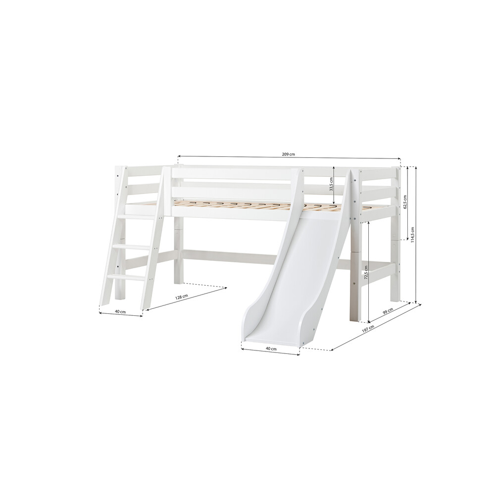 Hoppekids ECO Luxury half high bed 90×200 cm with slide and slanted ladder, Flexible slat frame, White