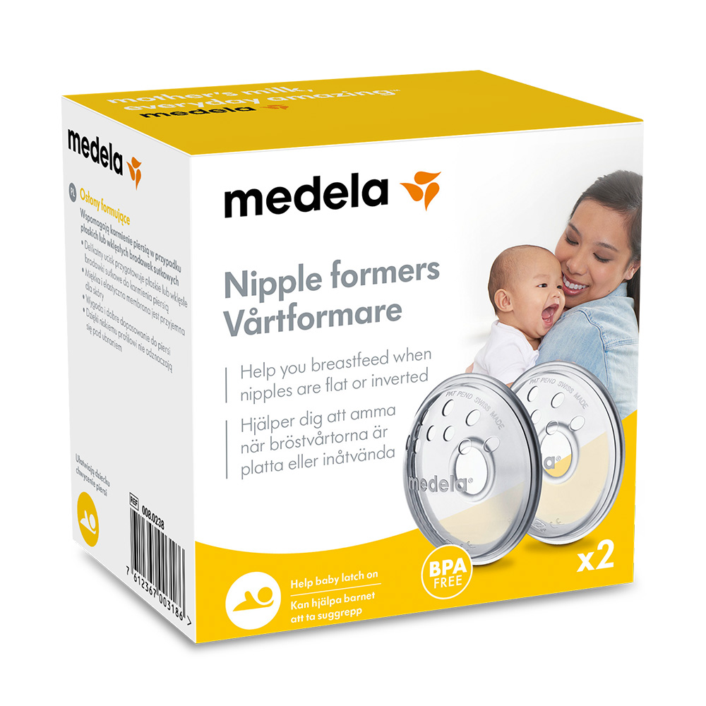 Medela nänninmuotoilijat ovat hellä menetelmä litteiden tai sisäänpäinkääntyneiden nännien valmistamiseksi imetystä varten. Hienotunteinen muotoilu takaa luonnollisen ulkonäön vaatteiden alla, ja pehmeä, joustava silikonikalvo tarjoaa tiukan ja mukavan istuvuuden, kun taas vanne kohdistaa hellävaraista painetta nännien vetämiseksi ulos.