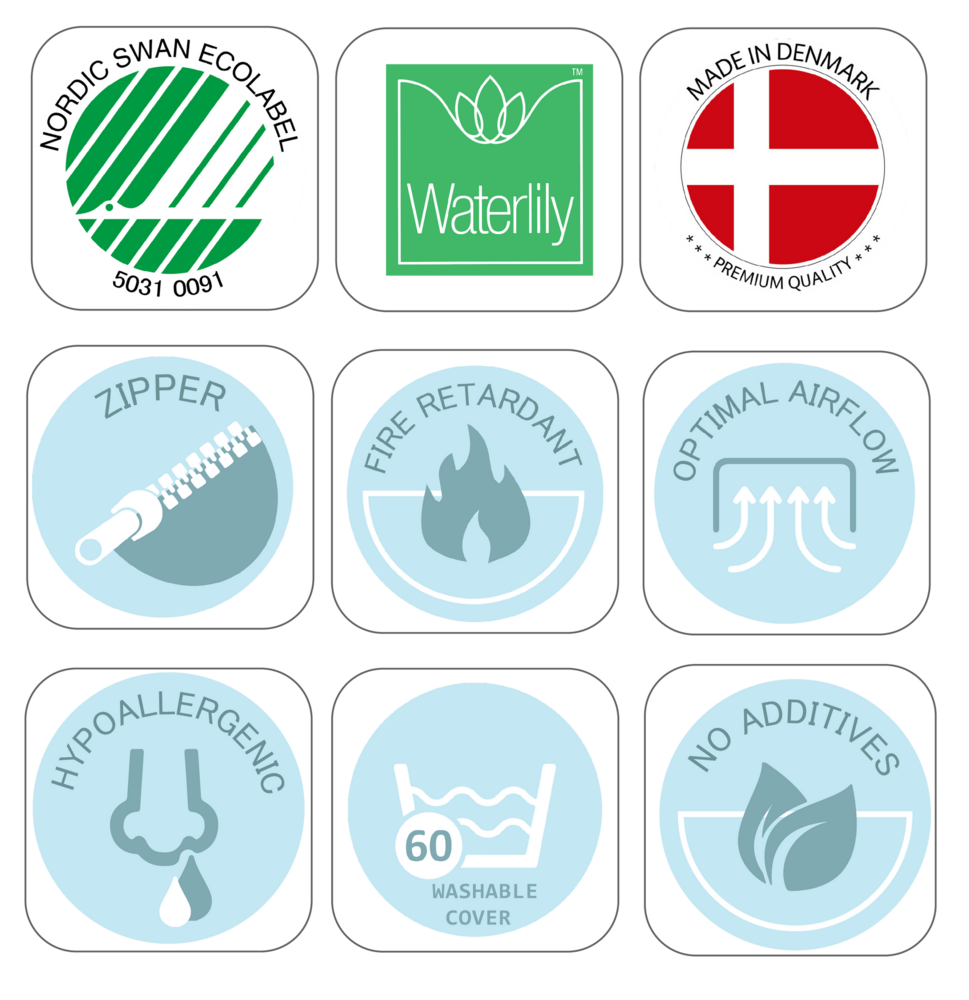 The ECO Luxury mattress consists of hypoallergenic foam with an extra soft Celsius top layer for optimal pressure relief and good air circulation. The mattress core consists of Waterlily® foam with a density of 45kg/m³ and a hardness of 145 Newton, the Celsius top layer has a relative density of 50kg/m³. The mattress is fire retardant and the cover fabric is unbleached. The raw materials can then be recycled. Including removable mattress cover (washable at 60°C). The mattress is 70x160cm and has a height of 12cm.