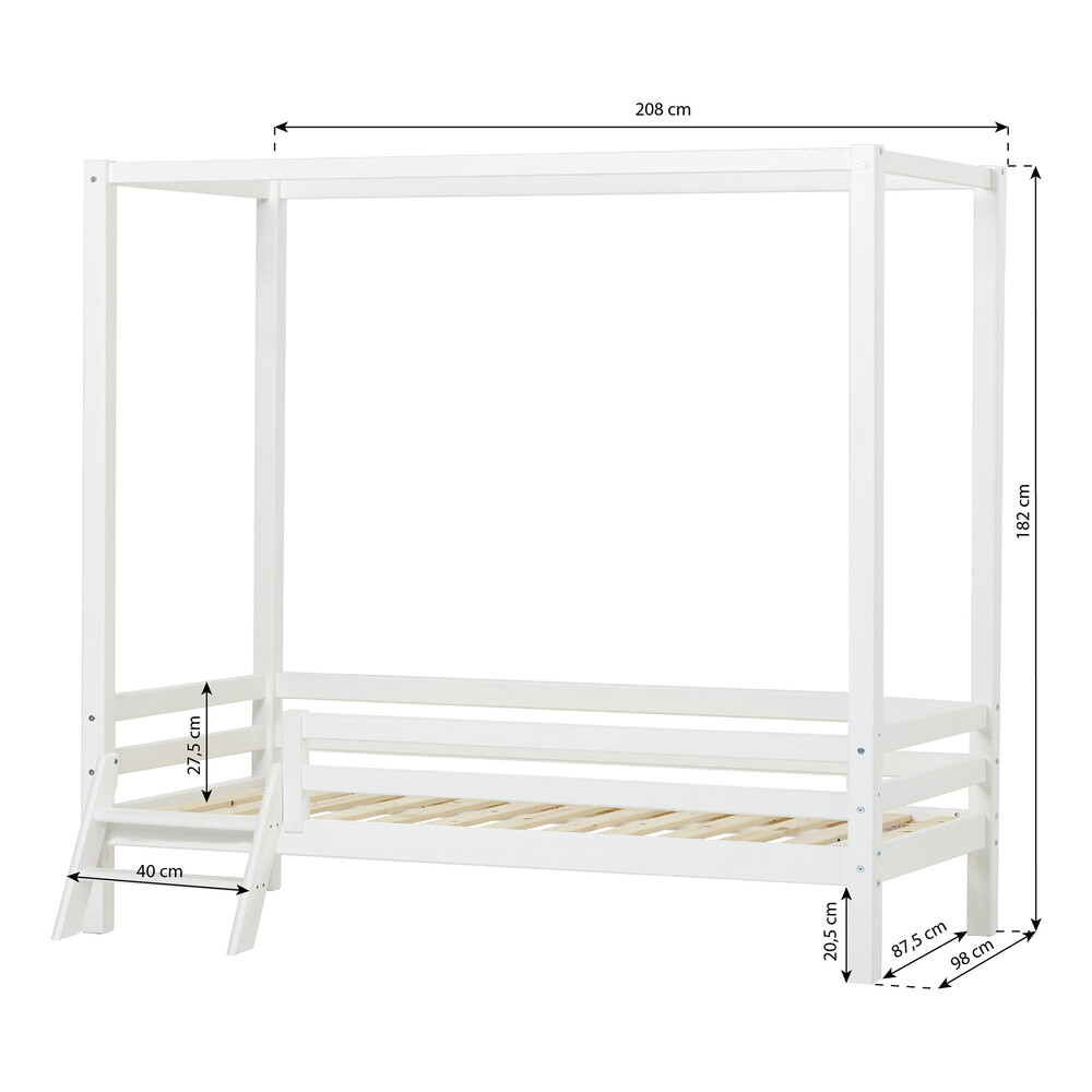 The Canopy Bed from Hoppekids size 90×200 cm is a beautiful bed with unlimited possibilities for decoration. The bed is certified with the Nordic Swan Ecolabel and the surface is treated with a water-based lacquer. Textile for the canopy bed is sold separately.