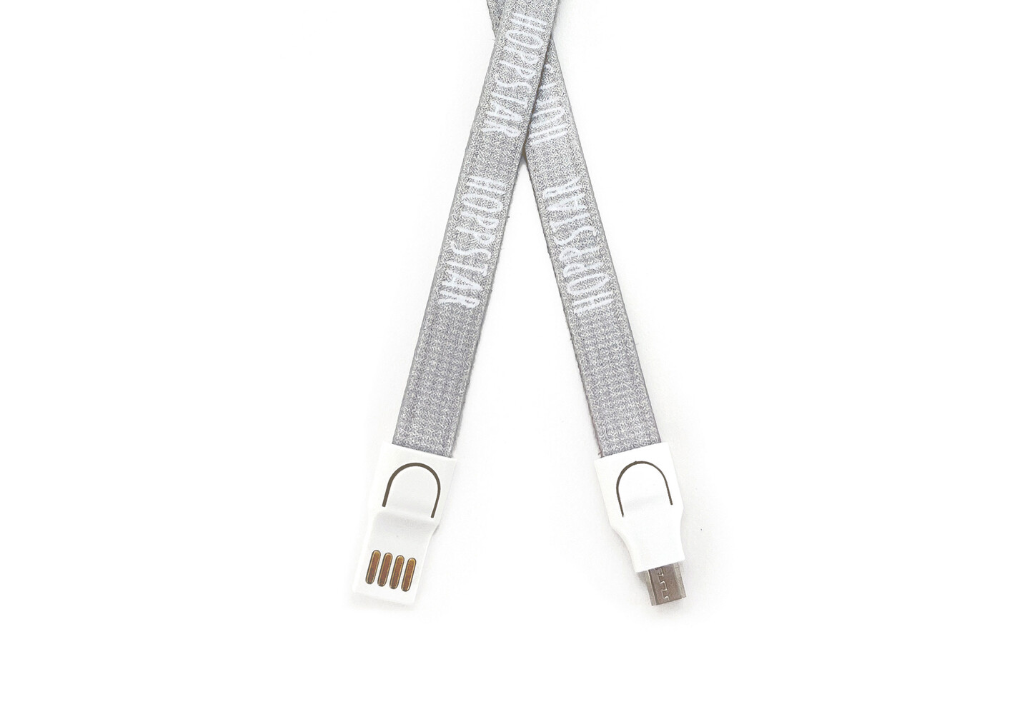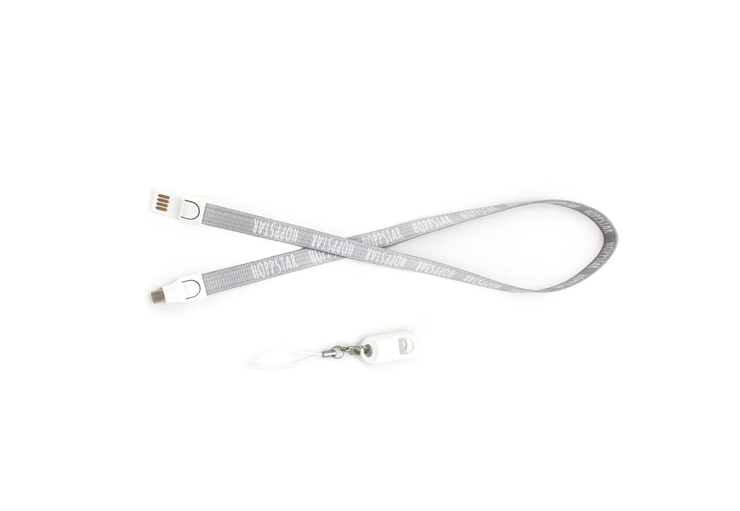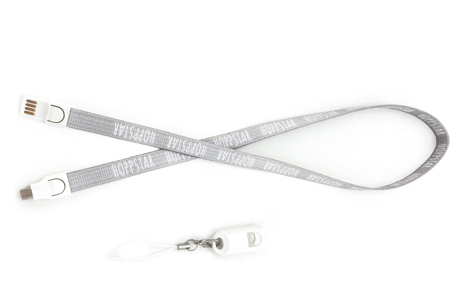 Käytännöllinen 2in1-kaulanauha: hihnassa on USB-mikro-USB-latauskaapeli. Tämä tarkoittaa, että latauskaapeli ei enää koskaan ole kadoksissa!