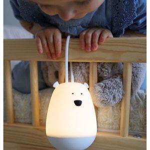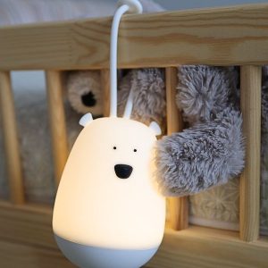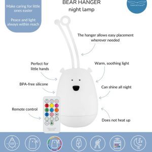 Rabbit & Friends kaukosäätimellä varustettu Hanger Bear —yölamppu täyttää tilan lämpimällä valolla. Se voidaan ripustaa sängyn viereen tai minne tahansa, mikä auttaa lapsia tuntemaan olonsa turvalliseksi yöllä.