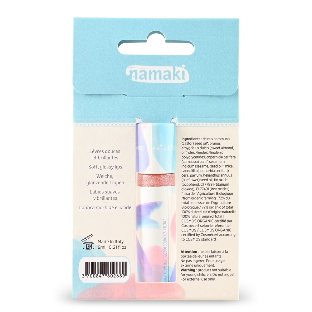 Namaki Huulikiilto on rikastettu luonnollisilla risiini-, seesami- ja manteliöljyillä, jotka jättävät huulet pehmeiksi ja suojatuiksi, antaen niille kiiltävän vaaleanpunaisen sävyn.