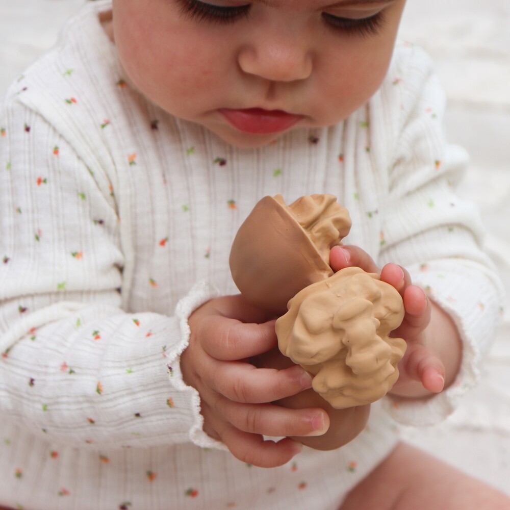 Oli&Carol vauvojen purulelu auttaa vauvan suun luonnollista kehitystä ja stimuloi samalla heidän aistejaan. Jokainen purulelu valmistetaan käsityönä yksitellen luonnonkumista ja maalataan käsin kasvien luonnollisilla pigmenteillä.