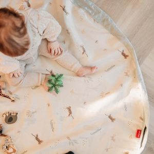 Leikkien jälkeen lelujen siivoaminen on nopeaa. Lapsen on helppo kerätä lelut maton keskelle ja kiristää se nyöreistä pussiksi. Lelupussin sisällä lelut säilyvät siististi seuraavan leikkihetkeen asti.
