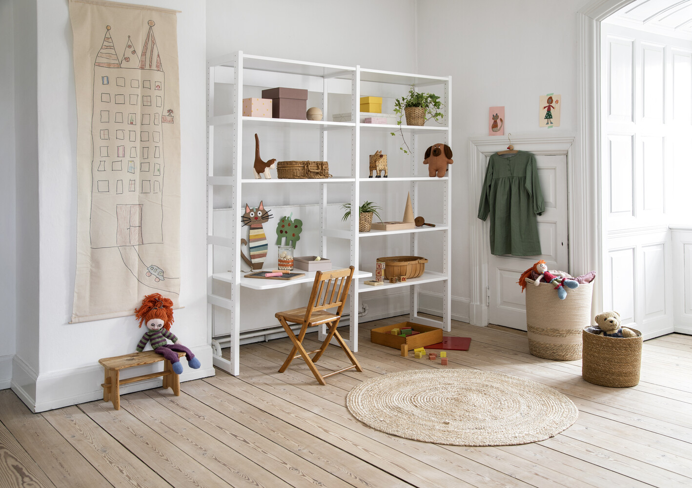 Hylly kokonaisuus sisältäen 2 osiota, 8 hyllyä ja työpöydän on osa Hoppekidsin STOREY mallistoa. Voidaan käyttää sellaisenaan tai jatkaa kokonaisuutta. Pinta on käsitelty vesipohjaisella, ympäristöystävällisellä lakalla. Pinta voidaan pestä kuivaksi käännetyllä liinalla ja miedolla saippuavedellä.