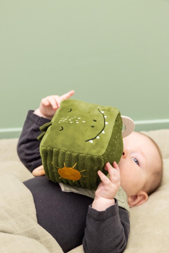 This charming Trixie activity cube promises endless exploration. It features a variety of textures, playful paws and a tail, a mirror, crinkly insides, and both a wooden and silicone ring – ideal for chewing, carrying, and tactile fun.