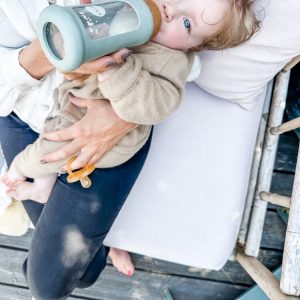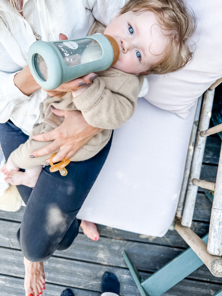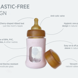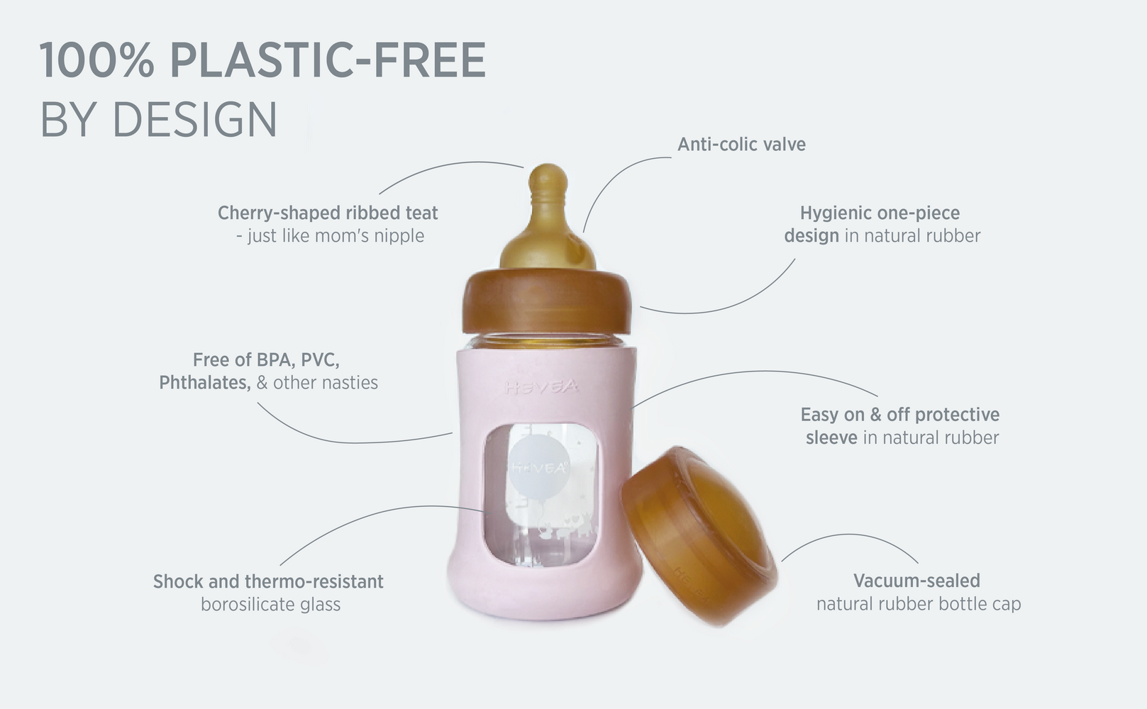 HEVEAn kaunis lasipullo luonnonkumisella suojalla. Suoja peittää pullon koko pituuden ja on saatavilla useassa värissä. Luonnonkumi suojaa käsiä vasta lämmitetyltä maidolta, ja pulloa rikkoutumiselta jos se pääsee putoamaan. Suoja on helppo ottaa pois ja laittaa takaisin pullon ympärille.